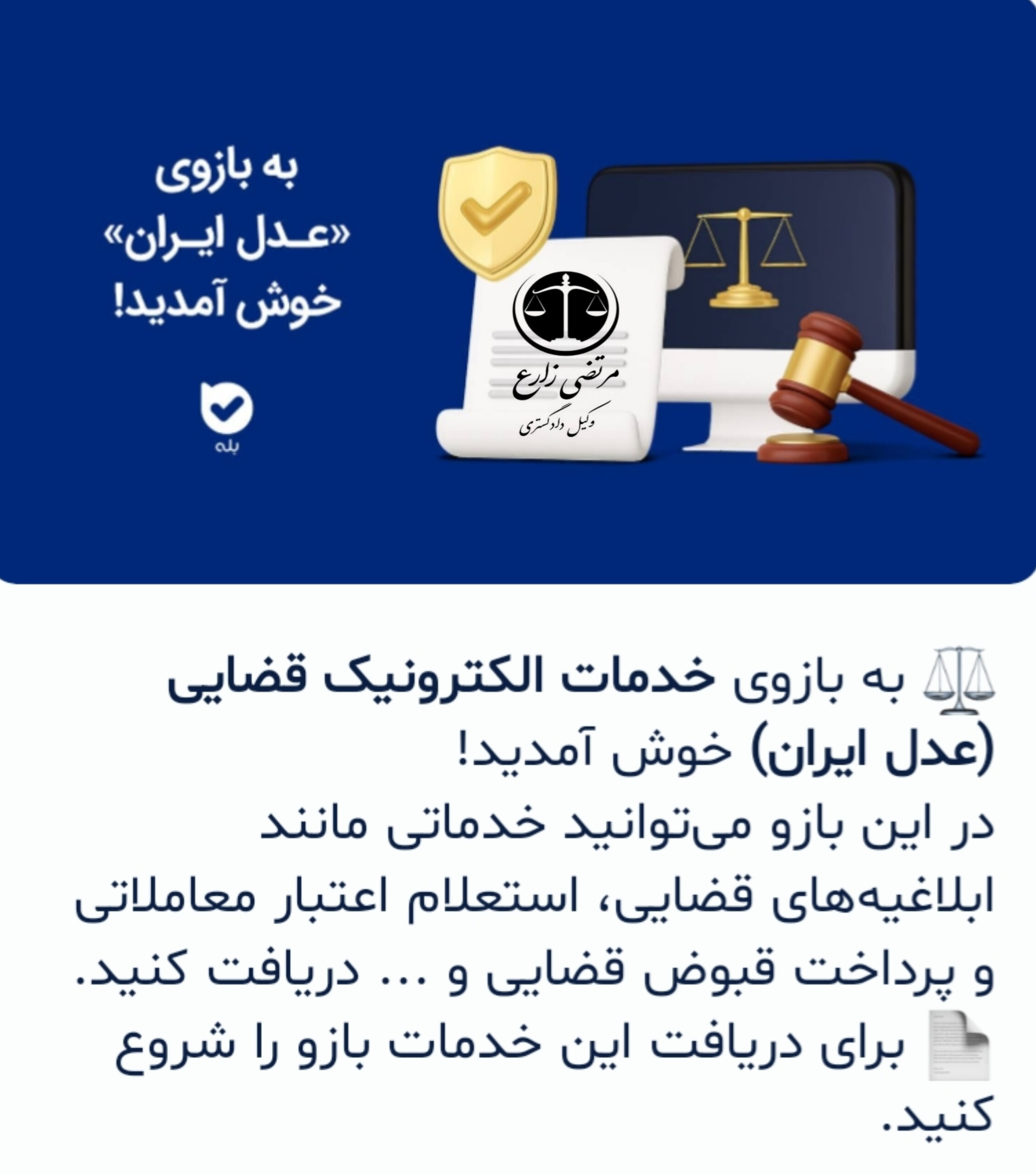 برنامه «بله» در قسمت خدمات خود، بازوی عدل ایران را اضافه کرده است، در این بازو شما با وارد کردن کدملی خود میتوانید پیامکهای عدل ایران را از جمله ابلاغیه و باقی موضوعات را روی این برنامک هم دریافت خواهید کرد.